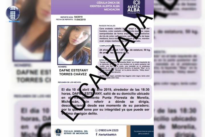 La Fiscalía General del Estado de Michoacán (FGE), logró la localización de una joven, sana y salva, que había sido reportada como desaparecida en esta ciudad de Morelia.
