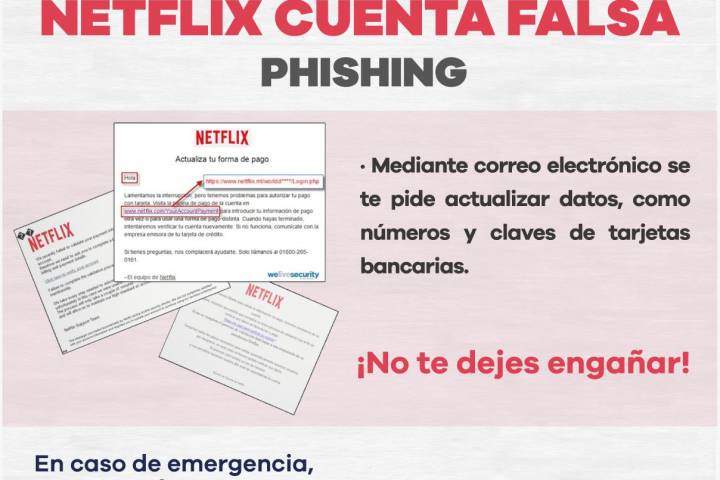 NOTICIAS 09/04/2019Alerta Unidad Cibernética sobre cuenta falsa de Netflix A fin de evitar ser víctima de robo de información personal, la Unidad Cibernética de la Secretaría de Seguridad Pública (SSP), alerta a la ciudadanía sobre un nuevo "phishing" de la empresa estadounidense de entretenimiento Netflix.