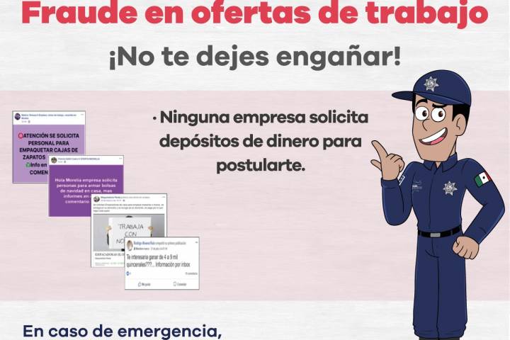 NOTICIAS 03/04/2019Alerta Unidad Cibernética sobre falsas publicaciones de ofertas de empleo La Unidad Cibernética de la Secretaría de Seguridad Pública de Michoacán (SSP), informa que ha detectado distintas publicaciones en redes sociales, de ofertas de empleo que, al parecer, solo intentan engañar a los postulantes.