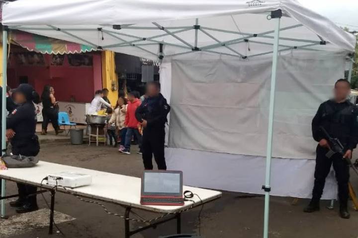 Personal del Agrupamiento de Peritos de la Dirección de Tránsito y Movilidad en colaboración con la Dirección de Seguridad Pública Municipal colocó una carpa en el centro de Quiroga, para atender a la ciudadanía.