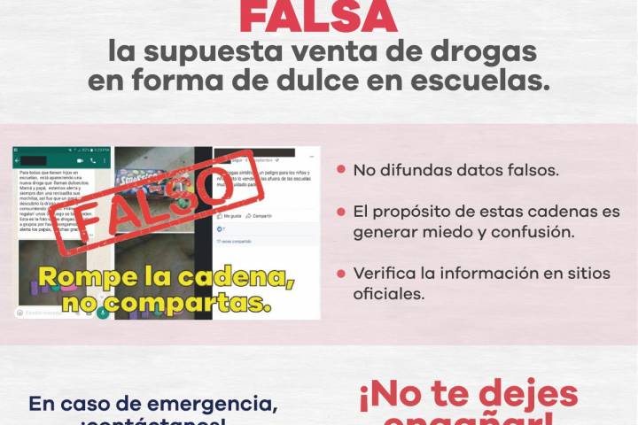 NOTICIAS 07/08/2018Falsa, alerta de venta de drogas en forma de dulce en escuelas: Policía Cibernética La Policía Cibernética de la Secretaría de Seguridad Pública (SSP), que encabeza Juan Bernardo Corona Martínez, da a conocer que es falsa la alerta que se maneja en redes sociales sobre la supuesta venta de drogas en forma de dulce en escuelas de la entidad.