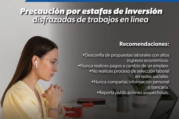 Estas incidencias, en su mayoría están relacionadas con estafas de inversión asociados a supuestas ofertas de trabajo ofrecidas a través de redes sociales. El engaño inicia con anu... Ver más...