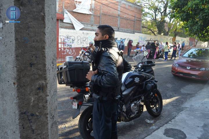 Elementos de la policía Morelia trabajan en el reforzamiento de la proximidad social a través de vigilancia en las escuelas y el contacto con padres de familia y profesores de las mismas.