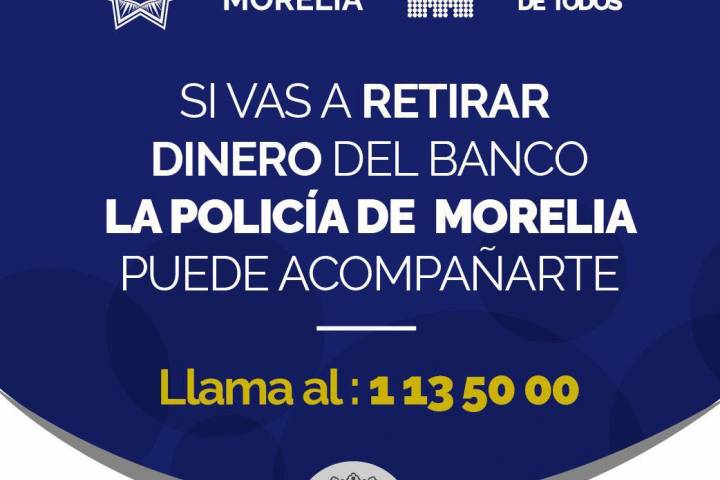 NOTICIAS 29/01/2018Policía de Morelia refrenda apoyo a ciudadanos con "Acompañamiento Bancario" En aras de fortalecer las condiciones de seguridad para que los ciudadanos realicen sus transacciones financieras, la Policía de Morelia reitera que el programa "Acompañamiento Bancario" sigue disponible para la población que requiera del servicio.