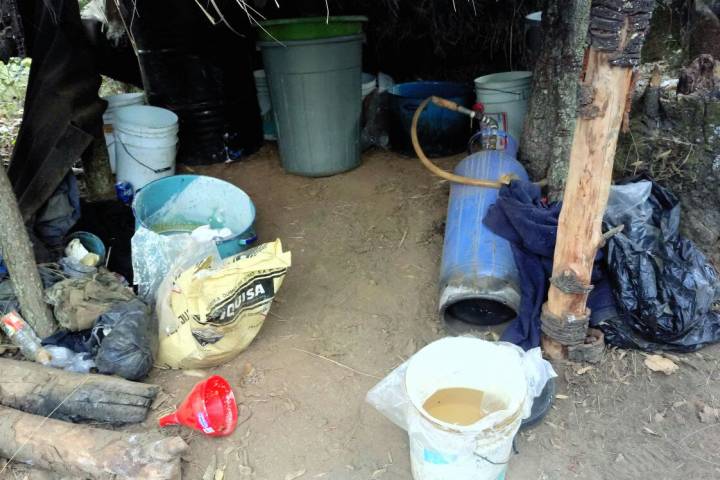 Durante un recorrido terrestre realizado por los elementos policiales entre el cerro de Hueco y Aracuaro fueron localizados varios utensilios que eran utilizados para la elaboración de droga sintética.