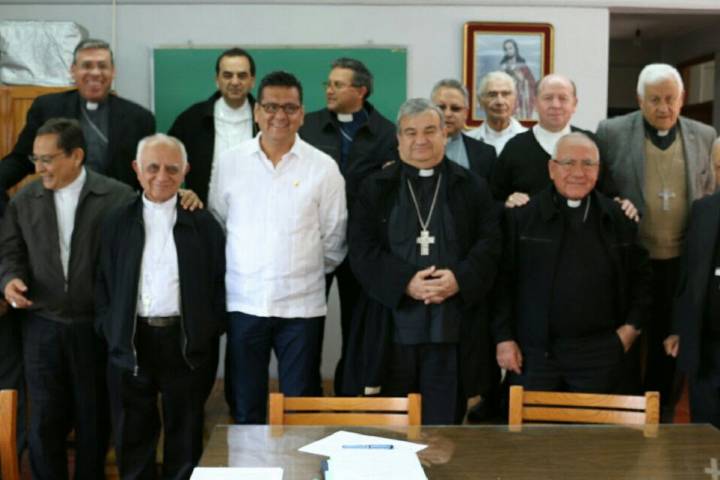 El funcionario estatal, el arzobispo de Morelia, Monseñor Carlos Garfias Merlos, el cardenal Alberto Suárez Inda e integrantes de esta... Ver más...