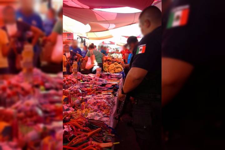 El despliegue operativo de los elementos se realizó en el tianguis de esta demarcación, donde se revisaron los puestos para evitar la venta de artículos que llegaran a poner en riesgo la integridad física de las personas.