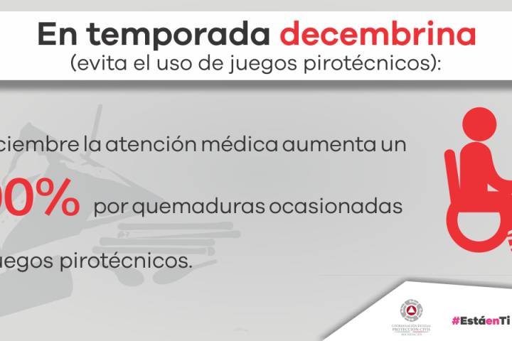 Siendo diciembre el mes en el cual aumenta en un 300 por ciento la atención médica por quemaduras ocasionadas por los juegos pirotécnicos, y de acuerdo con sector salud las lesiones más comunes que se presentan son en un 30 por ciento en los dedos, un 28... Ver más...