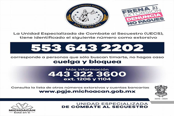 En el marco de las acciones llevadas a cabo para inhibir conductas ilícitas, la Procuraduría General de Justicia del Estado de Michoacán invita a los ciudadanos a denunciar el delito de Extorsión.