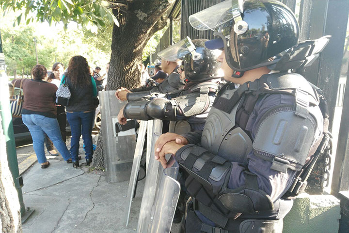 Ante la posible presencia de manifestantes, elementos de Operaciones Especiales resguardan las instalaciones de la Secretaría de Finanzas y Administración, ubicada en la Ventura Puente.