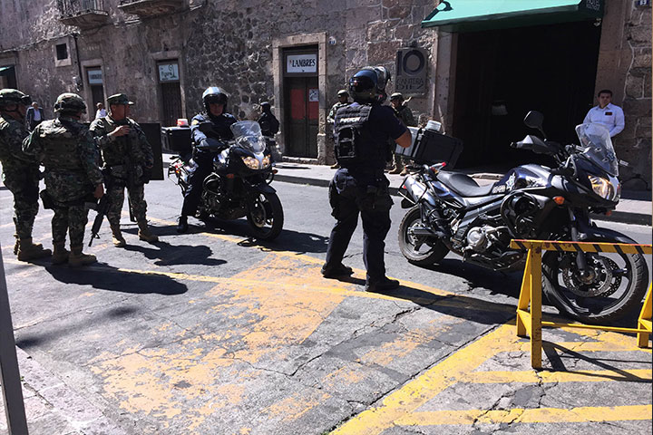 NOTICIAS 22/01/2015Instalan cerco de seguridad por la visita de Osorio ChongCon un cerco de seguridad de elementos de la Policía y el Ejército en el primer cuadro central de la capital michoacana, autoridades estatales y empresarios están a la espera de la visita del Secretario de Gobernación, Miguel Ángel Osorio Chong.