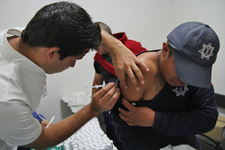 NOTICIAS 24/10/2014Vacunan a personal de Secretaría de Seguridad PúblicaCon el objetivo de prevenir infecciones virales respiratorias, y de aquellas que afectan el sistema nervioso y a la piel, fueron vacunados el personal administrativo y operativo de la Secretaría de Seguridad Pública.