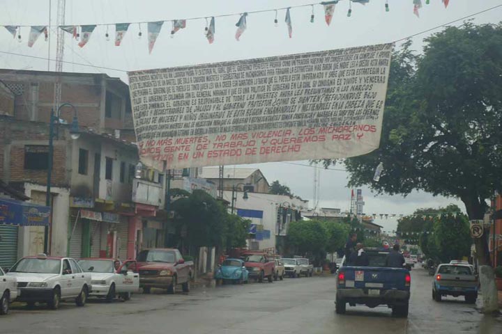 NOTICIAS 22/09/2013Re-aparecen los mensajes en mantas en varios municipiosLa mañana de este domingo aparecieron varias mantas en distintos puntos de la geografía michoacana, las cuales tenían un mensaje dirigido al gobierno federal sobre la problemática de Tierra Caliente, mismas que hasta el momento se ignora quién las colocó.
