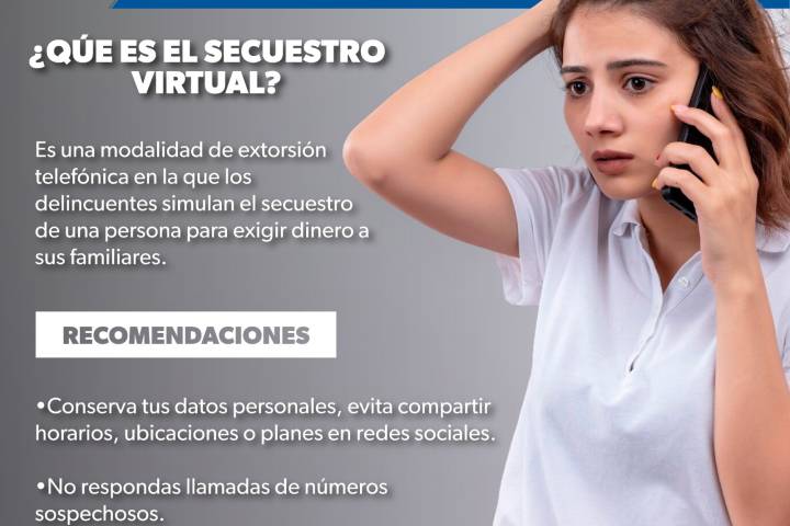 NOTICIAS 27/01/2025Conoce cómo prevenir el secuestro virtual con estas recomendaciones de la Policía CibernéticaEl secuestro virtual es un ilícito muy común en la actualidad, ante ello la Secretaría de Seguridad Pública (SSP), a través de la Policía Cibernética, te comparte la siguiente información para que conozcas y prevengas este ilícito.