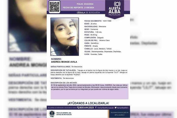 Se solicita la ayuda de la ciudadanía para localizar a Andrea Monge Ávila, de 25 años de edad, quien fue vista por última vez el pasado 18 de septiembre en la colonia Primo Tapia, en Morelia.