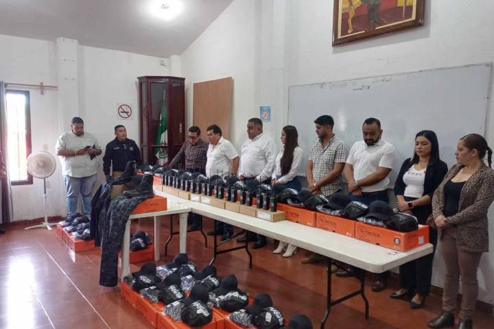 El presidente de Tacámbaro, Salvador Bastida García, y el tesorero municipal, Raudel Campos, entregaron uniformes, equipo táctico y 20 radios portátiles a la Guardia Civil de Tacámbaro, en un acto realizado en el aula de usos múltiples de Protección Civil.