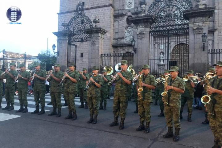 Soldados integrante de la Banda de Música de la XII Región Militar (Irapuato, Gto.), a manera de "Flashmob" entraron por los costados del Centro Histórico hasta posicionarse frente a la Catedral de Morelia, para entonar las melodías "Que lindo es Michoacán, Palomas Mensajeras, Juan Colorado y Caminos de Michoacán".