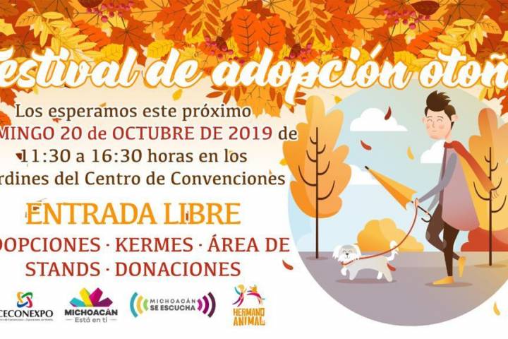 El inicio del otoño es la mejor oportunidad para adoptar una mascota, por esos te invitamos a que asistas al Festival de Adopción Otoño 2019 que se realizará este domingo 20 de octubre en los jardines del Centro de Convenciones de Morelia (CECONEXPO) de las 11:30 a las 16:30 horas.