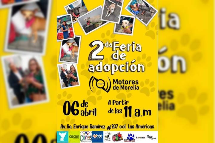 Asociaciones y animalistas independientes llevarán a cabo, éste sábado, de las 11 a las 18 horas, la Segunda Feria de Adopción Canina en Motores de Morelia, ubicado en el número 207 de la Avenida Enrique Ramírez Miguel, en la colonia Las Américas.