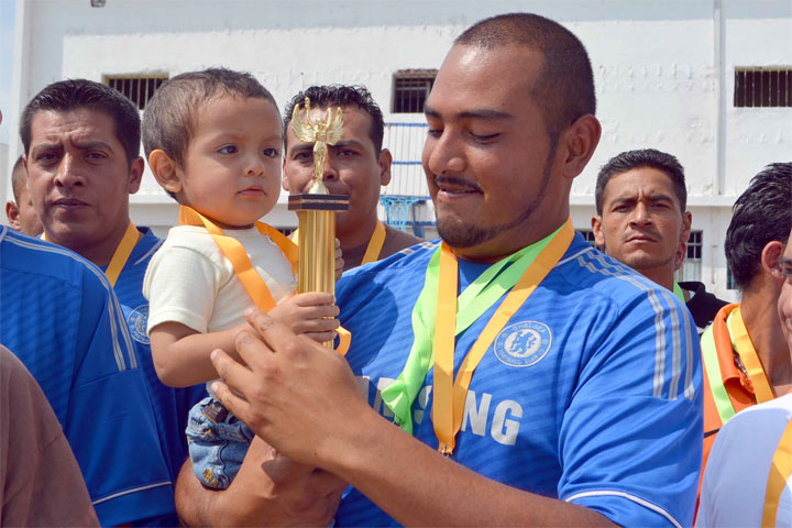 Con una sonrisa en el rostro y con los ojos llenos de una cosa que no puede ser más que amor, Cesar mira a su hijo, mientras lo besa y lo abraza cargándolo con un solo brazo, al tiempo que muerde una medalla recibida por ganar el primer lugar en fútbol, en la Olimpiada del Penal Francisco J. Múgica.