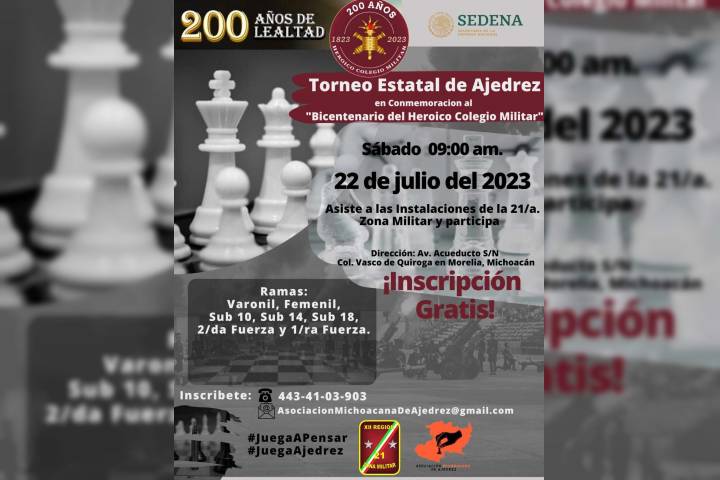 La Secretaría de la Defensa Nacional a través de la Comandancia de la 21/a. Zona Militar, hace una atenta invitación al público en general, para que asistan este próximo sábado 22 de julio del presente año, al Torneo Estatal de Ajedrez en Conmemoración al "Bicentenario del Heroico Colegio Militar".
