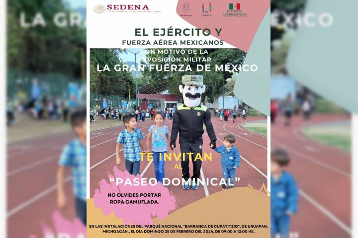 La Secretaría de la Defensa Nacional, a través de la Exposición Militar "La Gran Fuerza de México", invita al público en general a participar en el "Paseo Dominical", evento que promueve el sano esparcimiento, vínculos familiares y el acercamiento con las Fuerzas Armadas.