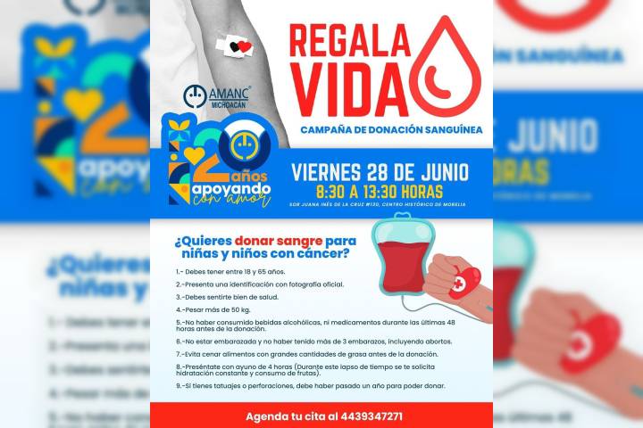 La Asociación Mexicana de Ayuda a Niños con Cáncer (AMANC) Michoacán, continúa sumando voluntades para brindar apoyo a las y los niños con este padecimiento a través de su campaña "Regala Vida", misma que tendrá su cuarta jornada de donación este viernes 28 de junio de 8:30 a 13:30 horas en Sor Juana Inés de la Cruz #130, col. Centro,