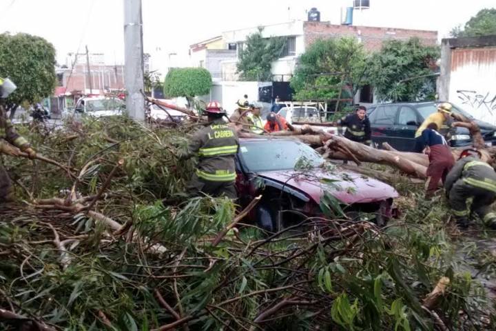 Un árbol viejo de eucalipto se vino abajo y causó daños en un auto abandonado y en el cableado eléctrico y de telefonía, lo cual sucedió en las calles de la colonia Granjas del Maestro, ubicada al norte de esta ciudad de Morelia.