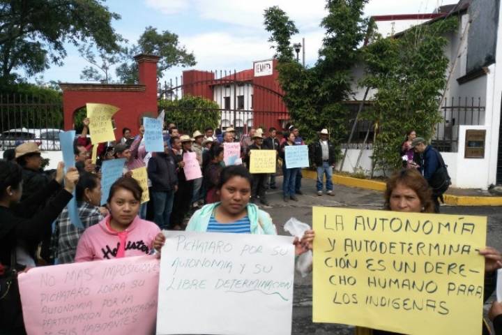 Habitantes de la comunidad indígena de San Francisco Pichátaro se manifiestan afuera de las instalaciones del Instituto Electoral de Michoacán (IEM) para exigir al órgano electoral de a conocer los resultados de la consulta realizada en la comunidad para la creación del Concejo Comunal.