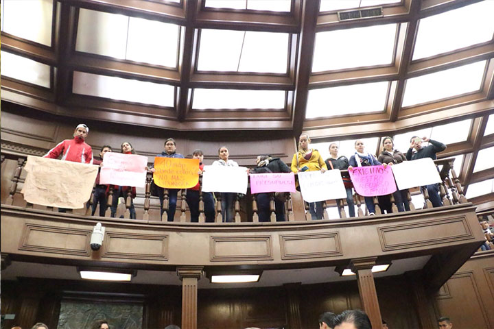 A la par de la protesta que mantienen en la Secretaría de Finanzas, los manifestantes arribaron a la sede del Poder Legislativo para demandar recursos que aseguran ya fueron depositados por la federación desde el pasado mes de junio.