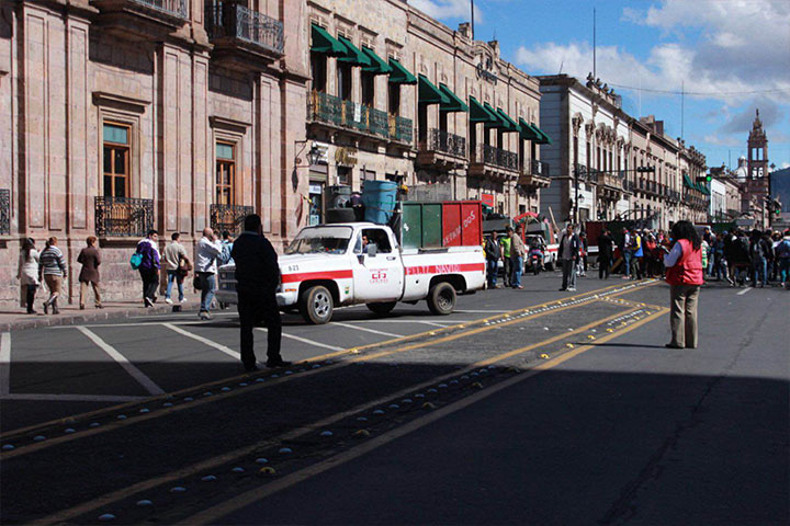 NOTICIAS 14/01/2016Antorchistas protestan frente a Palacio con camionetas de basura Ante los abusos y despojos de terrenos en el cerro del Quinceo, Marco Pérez García, integrante del Movimiento de Antorcha Campesina en Morelia, señaló que hasta que no se les resuelva dicho maltrato dejaran libre la avenida Madero.