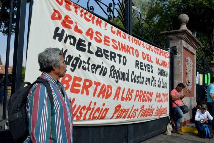 NOTICIAS 02/12/2015Protestan para exigir liberación de Cemeí y por el esclarecimiento de la muerte del niño Hidelberto ReyesAlrededor de 200 aquilenses se manifestaron la mañana de este miércoles a las afueras de Casa de Gobierno, donde exigieron la liberación de Cemeí Verdía Cepeda, líder de la Policía Comunitaria de Santa María de Ostula y el esclarecimiento del homicidio del niño Hidelberto Reyes García, ocurrido el domingo 19 de julio de este año, en Ixtapilla (Aquila).