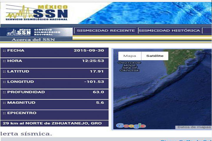NOTICIAS 30/09/2015Ocurre sismo de 5.2 grados al norte de ZihuatanejoEl Servicio Sismológico Nacional (SSN) informó que un temblor de magnitud 5.2 grados se suscitó a las 12:25 horas a 29 kilómetros al norte de Zihuatanejo, en el estado de Guerrero.