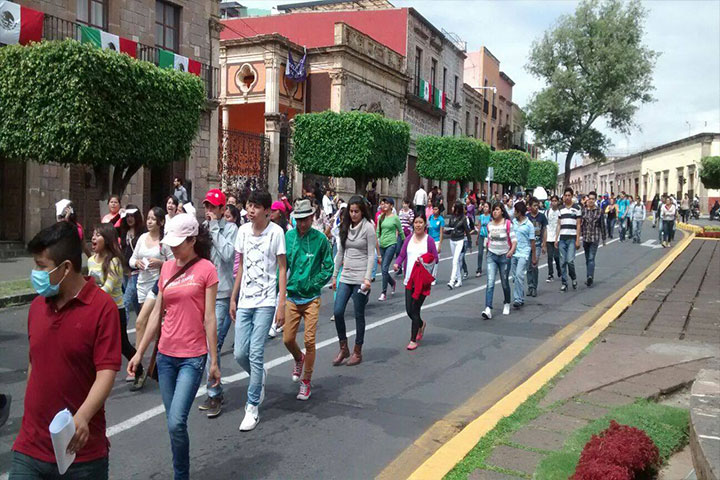 Los "integrantes del Movimiento de Aspirantes y Rechazados" van cantando consignas para hacer notar su molestia y que los morelianos sepan que los dejan fuera de la máxima casa de estudios en la entidad.