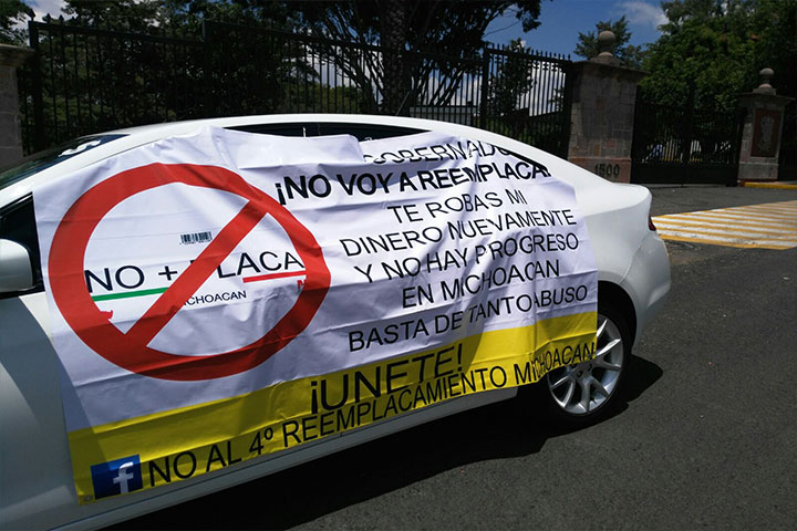 Con diversas leyendas escritas en los automotores en contra del impuesto anunciado por el Gobierno del Estado, los manifestantes iniciaron la movilización desde el Jardín Morelos con dirección a Palacio de Gobierno para dirigirse posteriormente a Casa de Gobierno donde pretenden concluir con la protesta.