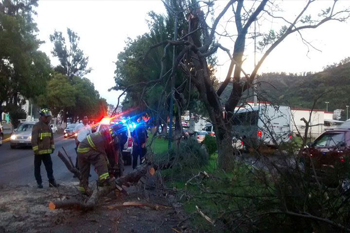 En diferentes puntos de esta ciudad de Morelia y casi de manera simultánea se vinieron abajo dos árboles, uno de ellos daño dos vehículos y un menor resultó levemente herido, sin que requiriera hospitalización.