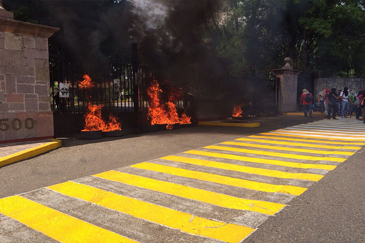En dos autobuses de la línea Purhepechas, aproximadamente 100 arribaron a la residencia oficial del Ejecutivo Estatal donde previamente protestaron y colocaron una lona en la que se leía "Fuera Peña".