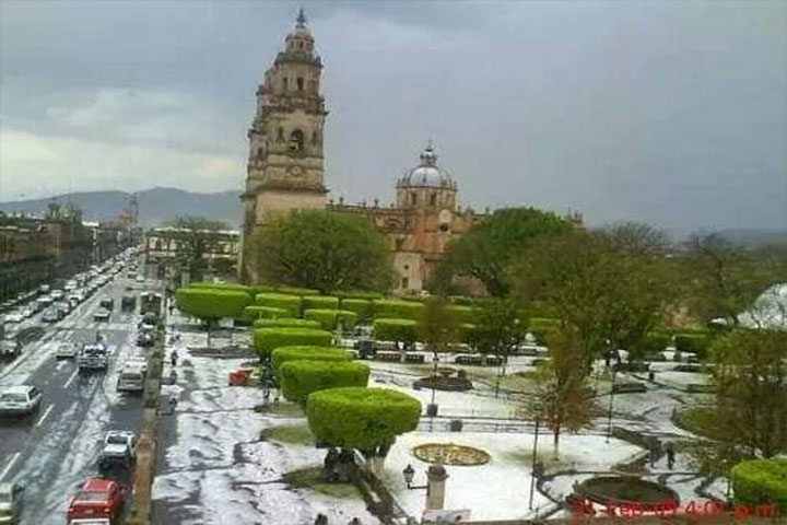 Una fuerte granizada cayó la tarde de este miércoles en esta capital michoacana, lo cual dejó blanquecinas varias calles y monumentos importantes, con lo que el frío se acrecentó. A raíz de la situación, la techumbre de un recinto eclesiástico colapsó.