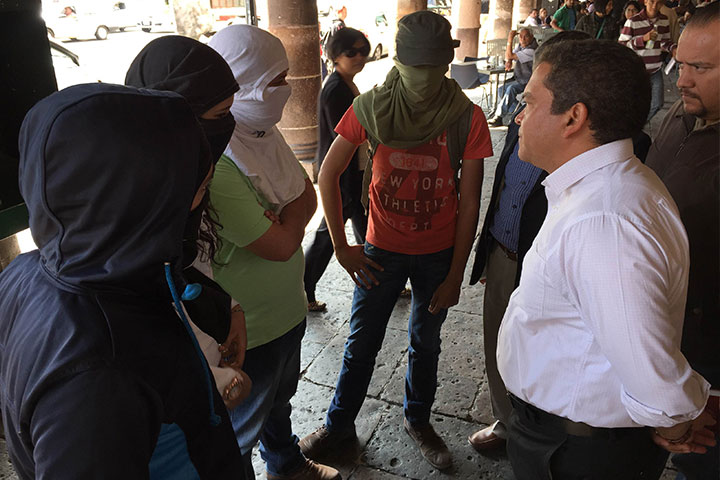 Jaime Darío Oseguera Méndez, Secretario de Gobierno, salió de Palacio de Gobierno para atender a los estudiantes normalistas que se manifiestan afuera del recinto, mientras que al interior se lleva a cabo la evolución de acciones y resultados de la Comisión para el Desarrollo Integral de Michoacán.