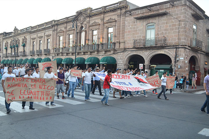 Nuevamente los estudiantes de las ocho escuelas normales de Michoacán, así como los alumnos de otras instituciones educativas, incluyendo la Universidad Michoacana de San Nicolás de Hidalgo, marcharon por las calles de esta ciudad, en pro del caso de Ayotzinapa, Guerrero.