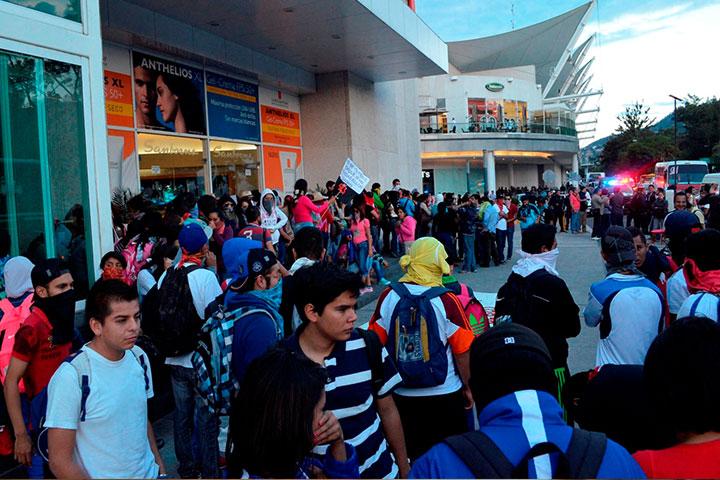 NOTICIAS 06/11/2014Normalistas protestan en plaza Morelia y Las AméricasEn al menos 5 autobuses normalistas arribaron a plaza Morelia donde bloquearon los accesos al centro comercial como parte de las acciones de protesta que han emprendido para exigir la aparición con vida de los 43 jóvenes de Ayotzinapa.