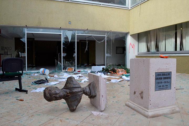 A su paso a demás los normalistas causaron severos daños al inmueble ya que rompieron puertas, ventanas y cristales desde el acceso principal del edificio estatal, incluso tumbaron un busto que hay en el lugar en memoria del falleci... Ver más...