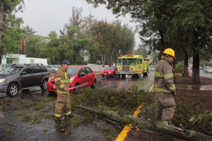 Al parecer debido a los fuertes vientos y a que un rayo le pegó, un árbol se desplomó y cayó sobre el cofre de un coche en movimiento, sin que por fortuna hubiera lesionados sólo daños materiales mínimos.