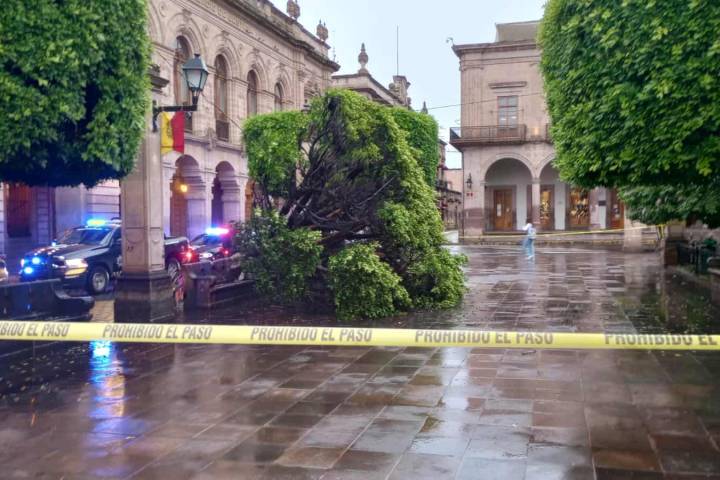 Uno de los casos tuvo lugar sobre la Plaza de Armas, en el Centro Histórico, a la orilla de la calle Abasolo, donde un árbol cayó sobre el respaldo de una de las bancas de cantera.