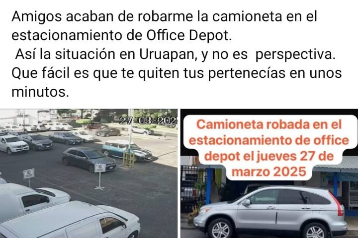 NOTICIAS 27/03/2025Roban camioneta al Diputado Local, Conrado Paz, en Uruapan Delincuentes robaron la camioneta del Diputado Local, Conrado Paz, del estacionamiento de la tienda Office Depot, sobre el Paseo Lázaro Cárdenas de Uruapan, hechos ocurridos la mañana de este jueves.