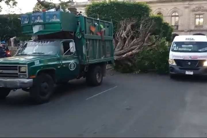 Una camioneta recolectora de basura, durante una maniobra de reversa chocó contra un árbol, el cual colapsó y en la acción alcanzó a derribar la punta de una columna de cantera ubicada en la Plaza de Armas del Centro Histórico de Morelia, indicaron fuentes allegadas al tema.