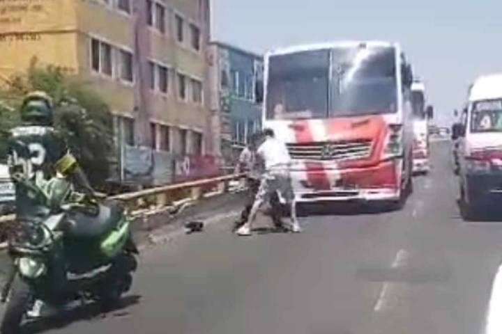 Un camionero de la Ruta Villas del Pedregal y un motociclista protagonizaron una pelea sobre el puente de la avenida Madero Poniente de Morelia, justo a la altura de la colonia Nueva Valladolid, informaron fuentes allegadas al tema.
