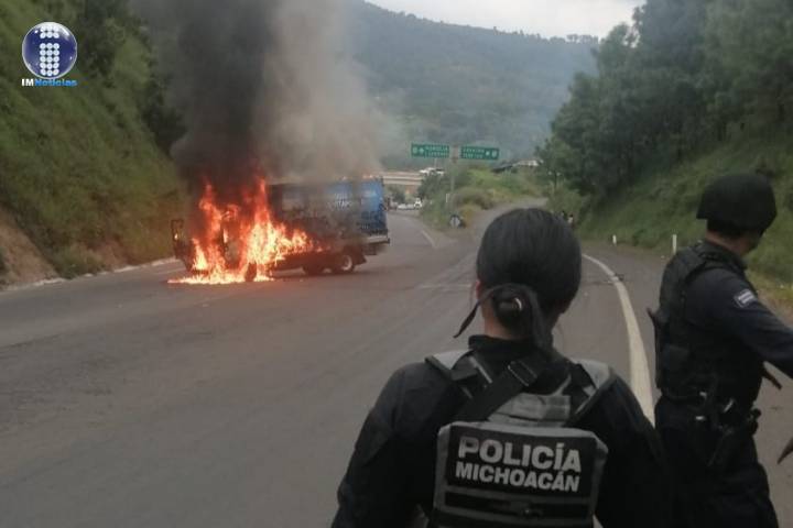 Estudiantes normalistas realizaron una protesta en la carretera libre Uruapan -Pátzcuaro, donde incendiaron un par de camionetas que previamente fueron despojadas a sus conductores.