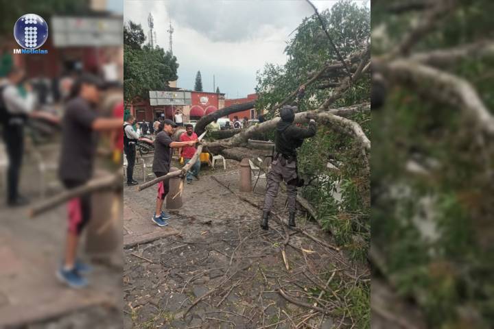 Un viejo árbol colapsó y cayó sobre las mesas y sillas de un negocio ubicado en el Centro Histórico de Morelia, cerca de la Fuente de Las Tarascas y del Acueducto. A raíz de ello, al menos cuatro personas resultaron levemente lastimadas por las ramas, comentaron fuentes policiales y de rescate.