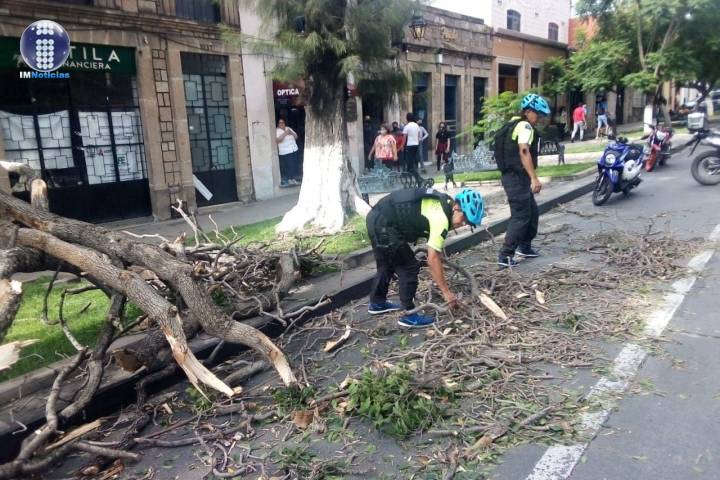 Al menos cuatro personas resultaron lastimadas cuando una rama de gran tamaño se desprendió de un árbol y cayó encima de la combi en la que viajaban los susodichos, situación registrada en la colonia Centro de Morelia.